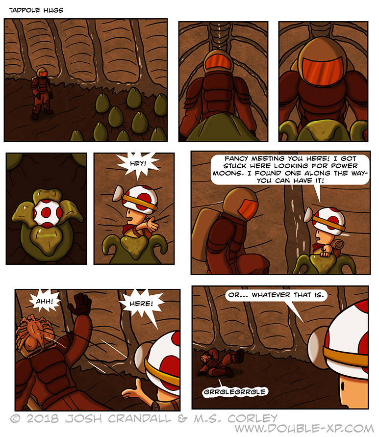 Tadpole Hugs No Comments on Tadpole Hugs So this comic is about… well, it’s not about anything. I just think the idea of Captain Toad showing up in an alien egg is funny. -Trevor